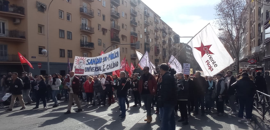 Il Blocco Combattivo e di Classe di cui fa parte il sindacato dei Comitati di Base (CoBas), è partito dalla Plaza de la Beata (vicino a Legazpi) alle 12:00 del mattino. Sullo striscione si leggeva: «Abrogazione Legge 15/97. Niente soldi per il privato. Sanità pubblica!». Come Corriente Roja ci uniamo a questa marcia con le nostre bandiere, gli adesivi e la stampa operaia.Durante tutto l’itinerario non hanno smesso di gridare slogan a favore della Sanità pubblica: «Sanità, sanità, pubblica e di qualità!», «Cure primarie, le più necessarie!» e contro la Legge 15/97 e la Sanità privata: «Abrogazione della 15/97! Niente, niente, niente per il privato!» Sono stati anche scanditi slogan contro Díaz Ayuso e a favore dello sciopero dei/delle sanitari/ie, che il governo della municipalità di Madrid cerca in tutti i modi di impedire, imponendo il 100% dei Servizi minimi, calpestando in questa maniera il diritto allo sciopero: «Ayuso pazienza, ci vediamo al pronto soccorso!», «Oh Ayuso, oh Ayuso, la vita gira, ti sei presa gioco di noi e ora ti cacciamo via!», «Dobbiamo sostenere lo sciopero nella Sanità!», questi alcuni slogan tra gli altri.