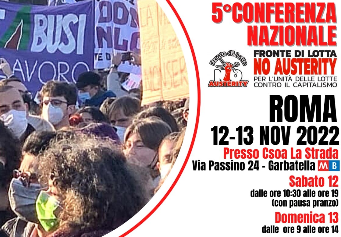 Dopo tre anni di impedimenti dovuti alla pandemia, il 12 e 13 novembre, a Roma, si svolgeranno i lavori della 5a Conferenza nazionale del Fronte di Lotta no austerity.