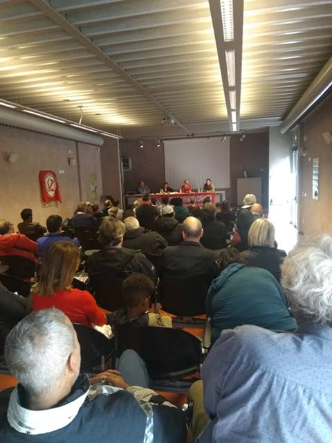Dopo l’intervento dei tre relatori vi è stata un’ampia discussione, arricchita dall’intervento di molti compagni. Ricordiamo in particolare l’intervento molto toccante di Luis Seclen, attivista del Fronte di Lotta No Austerity (Flna) e della Cub Monza, proprio in questi giorni sottoposta ad un vile attentato intimidatorio. Luis ha fatto intendere che gli operai non hanno alcuna intenzione di farsi intimorire e che questo attentato ha, al contrario, amplificato la solidarietà degli operai delle altre sigle sindacali, che si sono uniti alla manifestazione indetta dalla Cub di Monza. Un grande applauso di solidarietà è stato tributato a Luis e agli operai presenti.